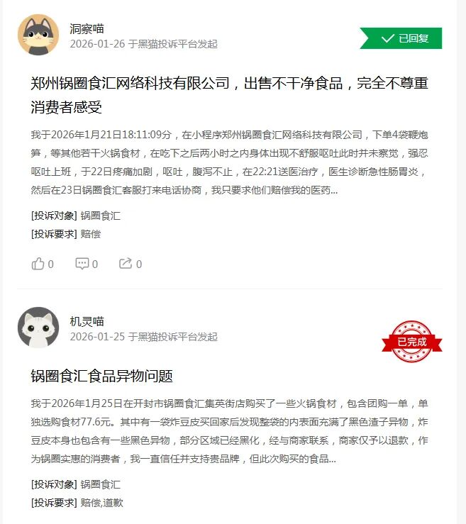 2025年,公司估计收入77。5亿元—78。5亿元,同比增加19。8%—21。3%;估计实现净利润4。43亿元至4。63亿元,同比增幅83。7%至92%。做为社区餐饮供应链品牌,锅圈从打“正在家吃暖锅、烧烤”场景,公司营收正在2022年达到71。73亿元高点,并于次年登岸港股。但上市首年业绩便呈现“变脸”,跟着公共卫生事务竣事,居家暖锅需求回落,2023年公司收入下滑15%至60。94亿元;2024年略有回暖,营收增至64。7亿元,但仍未回升至2022年的峰值程度。年报显示,2023年、2024年锅圈门店数量别离为10307家、10150家,呈现必然下滑。2025年,创始人杨明超喊出要再开1万家店的豪言,截至昔时岁尾,公司门店数量达到11566家,较岁首年月添加了1416家。值得留意的是,截至2025年9月,锅圈门店总数还逗留正在10761家,相当于第四时度3个月净增门店805家,跨越了前9个月总和,扩张提速。跟着门店规模扩大、店均收入提拔,叠加运营效率优化,配合鞭策了锅圈2025年焦点业绩目标的增加。不外,亮眼业绩难掩锅圈运营存正在的短板,其高速扩张背后的加盟模式现患正持续。据悉,锅圈99。9%的门店为加盟店,自营门店仅十余家,这种模式虽支持了企业快速扩张,却也带来了门店管控难度大、食物平安事务易发等问题。就正在近期的1月15日,杭州一名消费者通过外卖平台正在锅圈食汇订购的食材中,发觉一盒出产日期为2026年1月12日、保质期仅2天的老豆腐。经多方协商,门店最终补偿该顾客300元。针对此事,锅圈公关部答复,涉事豆腐属于公司“授权答应门店自行采购并发卖的商品品类”,根据相关合同取,此类“自采商品”的采购、储存、办理及售后义务,应由做为运营从体的加盟门店自行承担。这一回应,将品牌总部取加盟门店的义务进行了切割。据报道,2025年11月,白山一名消费者爆料其正在锅圈食汇采办的毛肚中发觉一只苍蝇;同年10月,有网友正在“七珍菌菇荟”产物中发觉;9月有消费者赞扬,锅圈食汇的暖锅底猜中呈现蛆虫,监管部分介入协调。截至目前,黑猫赞扬平台上,锅圈食汇的相关赞扬达396起,多涉及食材异物、变质、食用后腹泻等问题。
