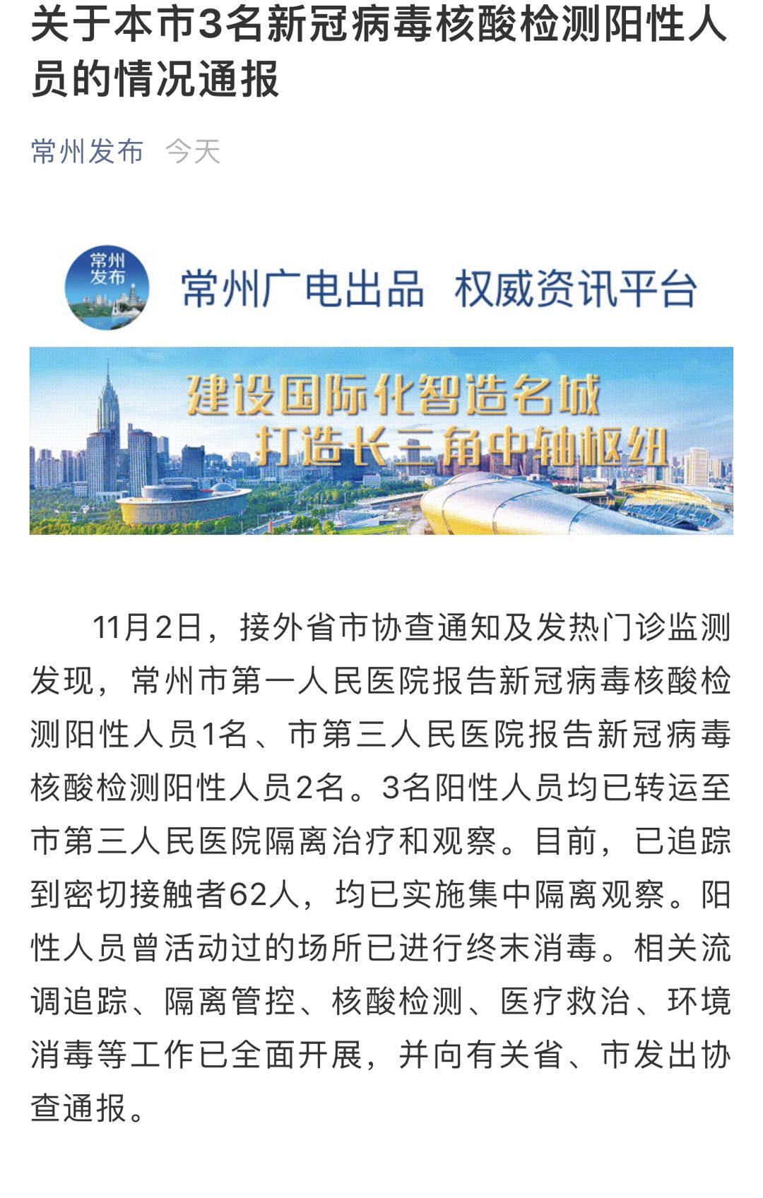 常州市第一人平易近病院演讲新冠病毒核酸检测阳性人员1名、市第三人平易近病院演讲新冠病毒核酸检测阳性人员2名。3名阳性人员均已转运至市第三人平易近病院隔离医治和察看。目前,已逃踪到亲近接触者62人,均已实施集中隔离察看。阳性人员曾勾当过的场合已进行终末消毒。相关流调逃踪、隔离管控、核酸检测、医疗救治、消毒等工做已全面开展,并向相关省、市发出协查传递。