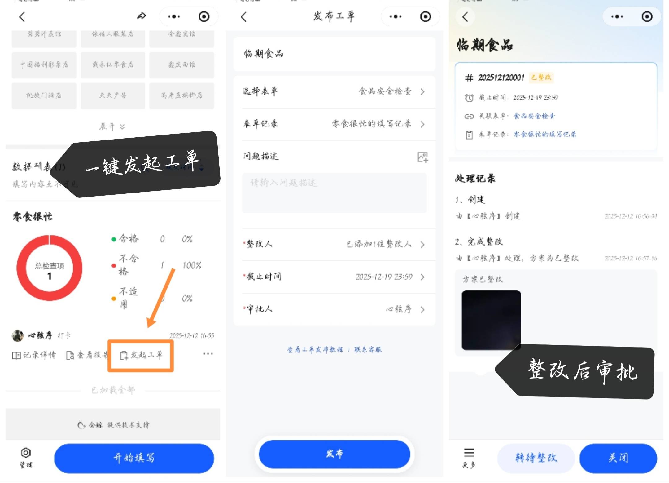 企鲸针对 “冰箱温控”“消毒池利用” 等环节项,支撑设置 “水印摄影” 功能:提交时必需上传带时间、地址水印的照片,且水印无法点窜。如许一来,督导查抄不再是 “凭经验打分”,而是 “有图有根据”,从底子上杜绝形式从义,为总部监管供给靠得住记实。企鲸的工单功能是处理 “查抄走过场” 的焦点。督导发觉问题(好比临期食材未分类),可间接正在查抄单上 “倡议工单”,工单封闭。