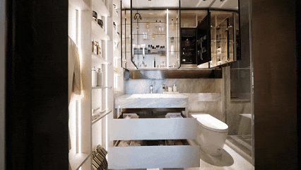 从卫收纳系统面面俱到,双面镜镜柜合理操纵上墙空间,为收纳扩容,为化妆加分;美妆冰箱为护肤品、化妆品锁鲜;台盆柜巧妙躲藏日常洗漱用品,让卫生间连结整洁有序。